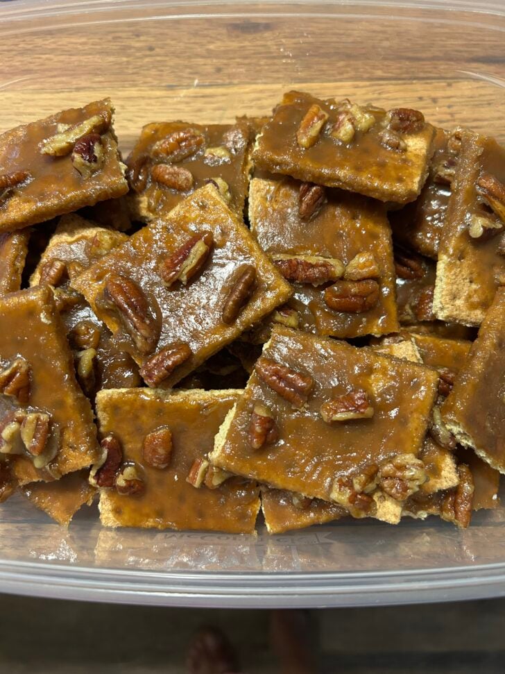 I love this recipe. My family loves this recipe. It’s so easy to make. I wind up using a whole box of graham crackers whole pound of butter and 2 cups of crushed chopped pecans. I didn’t have vanilla. My granddaughter borrowed it so I didn’t have any, but it makes a great easy dessert. My family loves it and it would make a great holiday gift.
