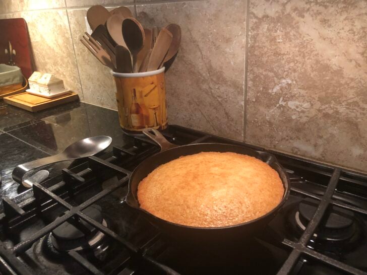 Don’t let your eyes fool ya! That’s not cornbread. Sure, it may look like cornbread because it’s cooked up in a cast iron skillet, but that, my friends, is an absolutely delicious cake. Aunt Betty’s Old Fashioned Skillet Cake is baked in a cast iron skillet with no fuss and all the nostalgia. It’s perfectly sweet, soft, and easily fixed up with a dollop of whipped cream, a scoop of ice cream, a drizzle of fruit syrup, a topping of fresh fruit, or perhaps even a little bit of chocolate gravy. Or, you can just eat it as is!