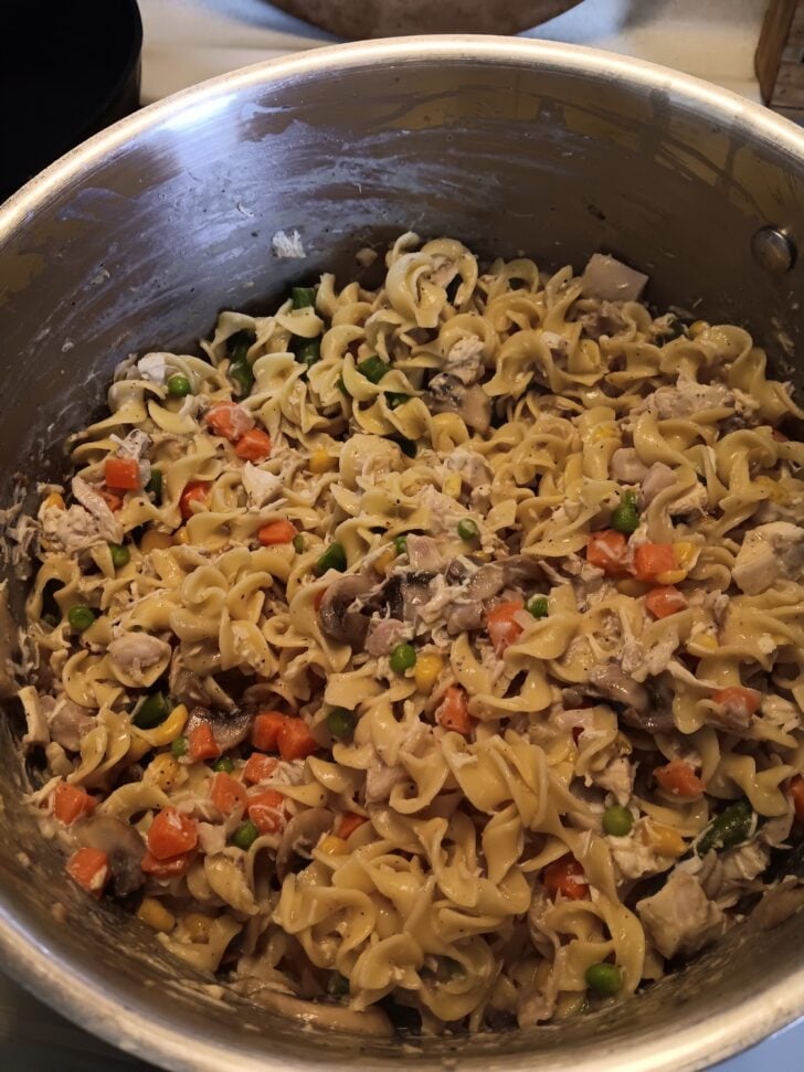 It was during supper one night, while I was eating this same Alfredo version, that I thought… “I wonder what it would be like to combine the creamy filling of a chicken pot pie recipe with egg noodles…”