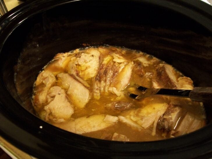 Adding too much grease in with the stock can make for greasy gravy – and no one wants that. You can also use one of these handy dandy grease strainers (affiliate link). Then add enough boxed stock to your pan drippings to make a total of 2 cups of liquid as called for in the recipe.