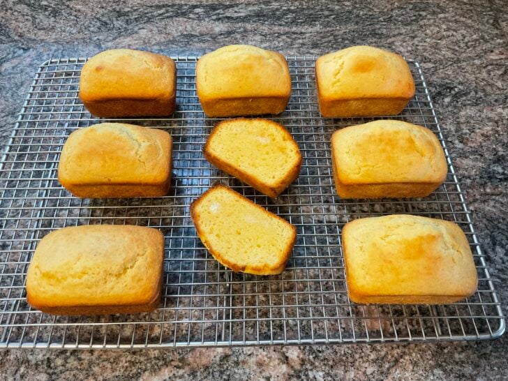 OK, this time I doubled the recipe and filled eight, lightly greased mini loaf pans. The cornbread released alright, although a piece of parchment at the bottom would lower the risk of sticking. I hope you don’t mind me saying that I added a couple of tablespoons of Greek yogurt to boost the moistness. I do that with cookies often.
