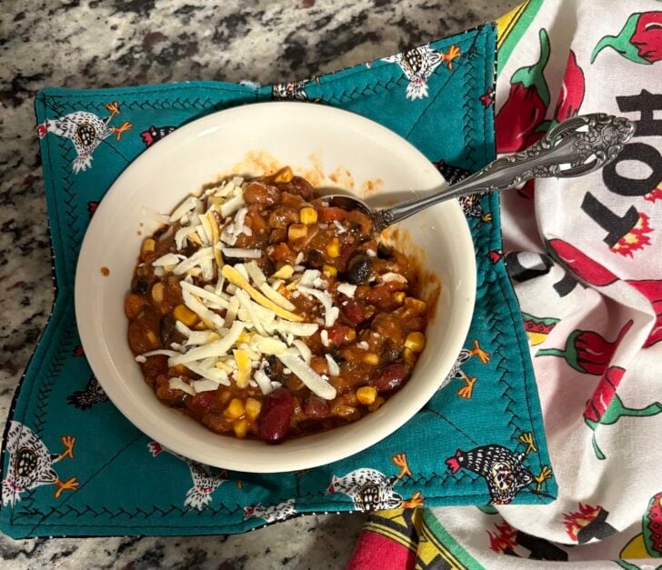 I love it served over rice, but know lots of folks that like it with some corn chips on top. It’s also great with some shredded cheddar and a dollop of sour cream.